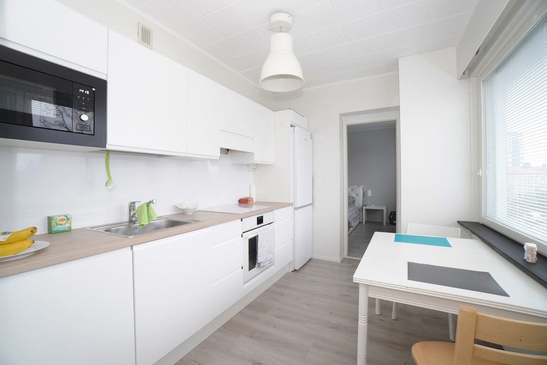 Lisäksi varustukseen kuuluu jääkaappipakastin ja astianpesukone. Olohuone ja makuuhuone ovat reilun kokoisia ja seinäpinnat ovat vaaleat. Ikkunat on hiljattain uusittu ja niissä on sälekaihtimet. Asunnossa on reilusti säilytystilaa, sillä asunnossa on kaksi vaatehuonetta! Kylpyhuone on kauttaaltaan remontoitu ja pesukoneelle on liitännät. Kaikki keskustan palvelut ovat kävelyetäisyydellä.