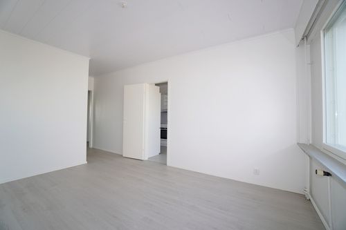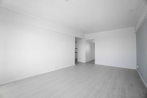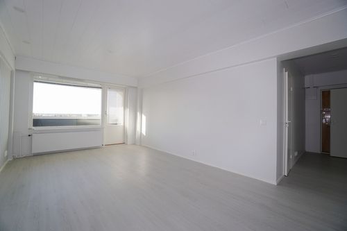 Asunnon lattiassa on vaalea yhtenäinen laminaatti kauttaaltaan ja seinäpinnat on uusittu. Olohuone on todella tilava ja sinne mahtuvat varmasti kaikki kalusteet.