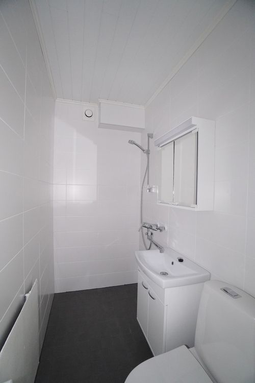laattalattia; laattaseinä, allaskaappi; peilikaappi, suihku, pesukonevalmius; taloyhtiössä pesutupa