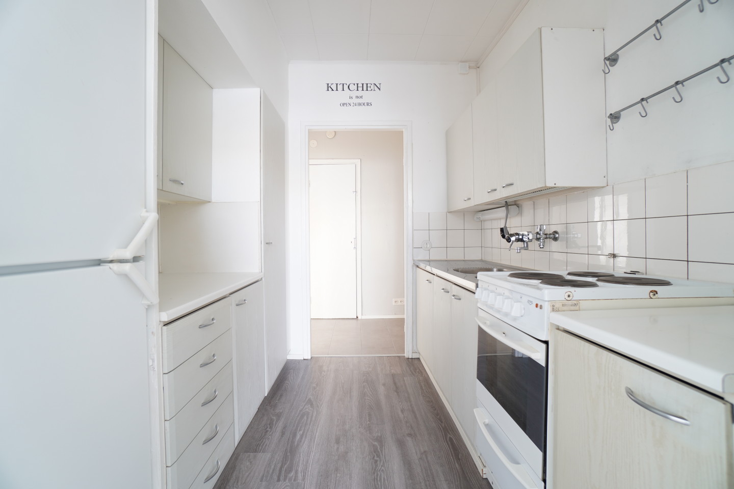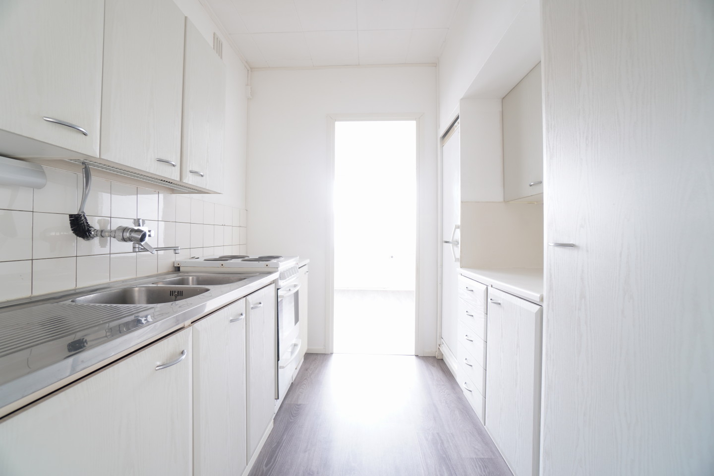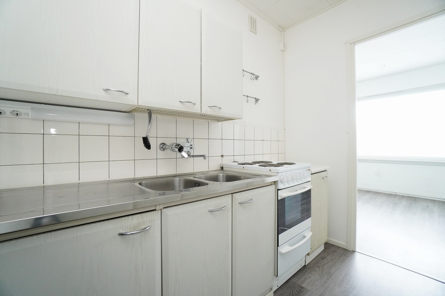 erillinen keittiöterästasot keittiössä; laminaattitasot keittiössä, sähköliesi, , jääkaappipakastin, tilaa isolle ruokapöydälle; paljon kaappitilaa; paljon työskentelytilaa; suuri tiskipöytä
