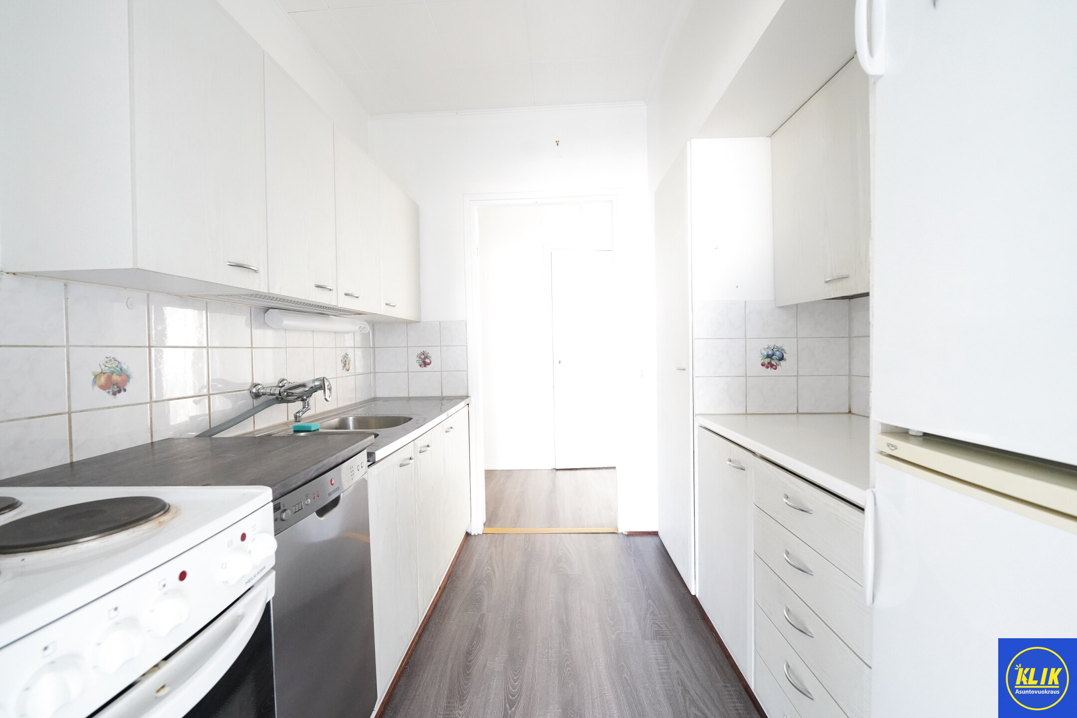 erillinen keittiölaminaattitasot keittiössä, sähköliesi, astianpesukone (45cm), jääkaappi; pakastin,