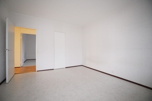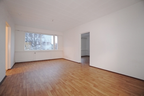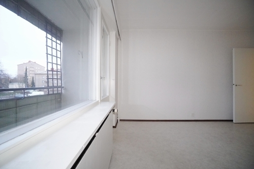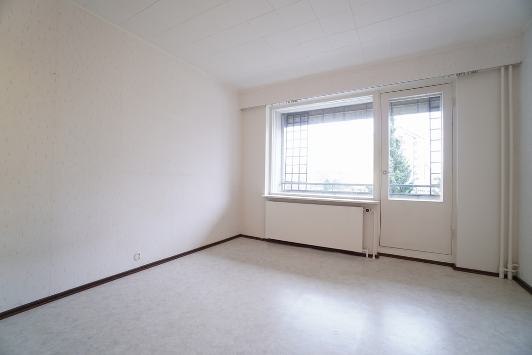 Olohuone on myös hyvänkokoinen ja sen yhteydessä on parveke. Asunnossa on parkettia sekä osassa huoneita on vaalea muovimatto. Kylpyhuoneeseen saa pyykinpesukoneen ja se on perusilmeeltään siistissä kunnossa.
