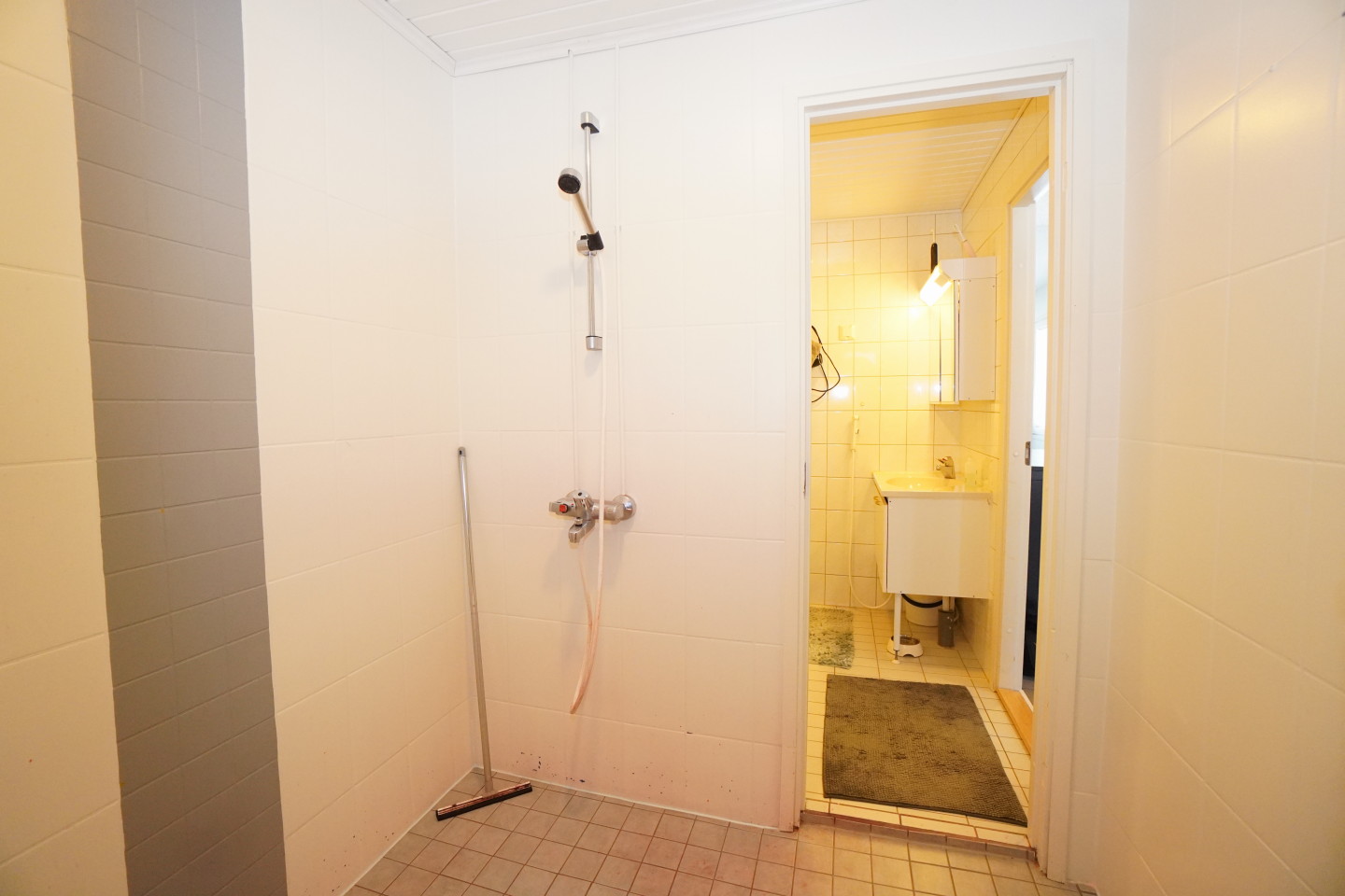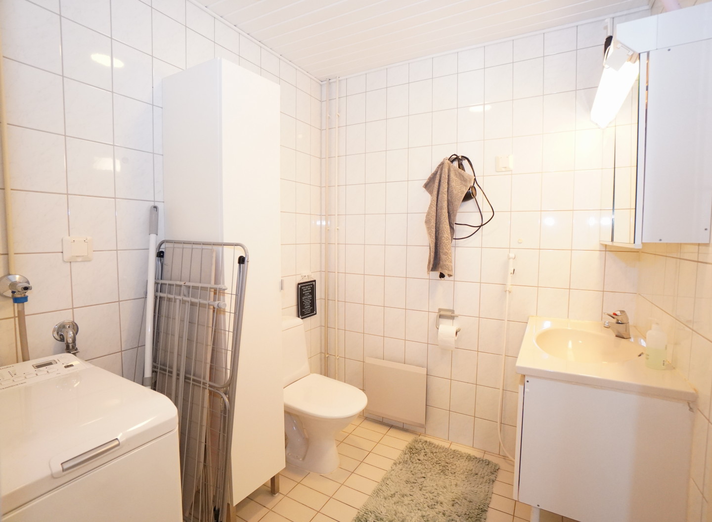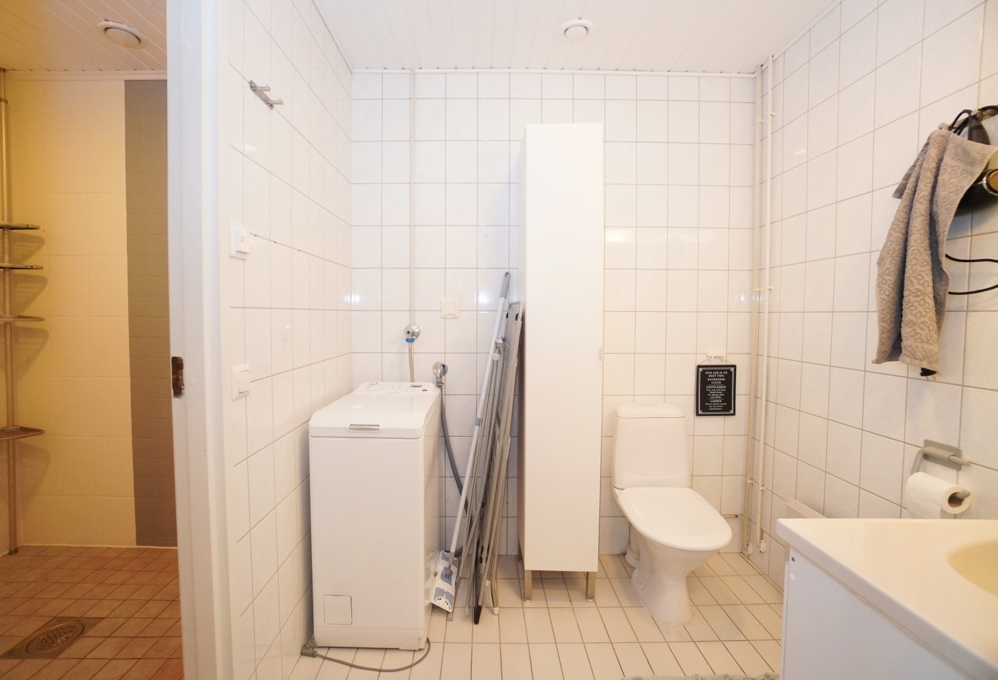 laattalattia; laattaseinä, , allaskaappi; peilikaappi; korkea kaappi, suihku, , pesukonevalmius, kylpyhuoneessa lattialämmitys; oma sauna