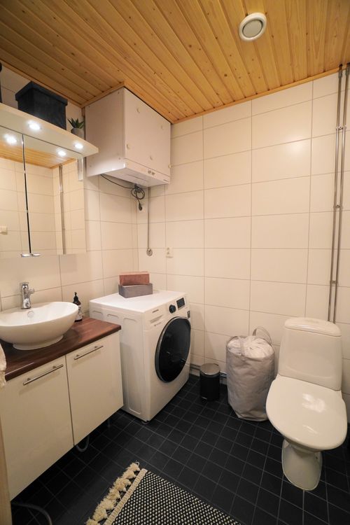 Kylpyhuoneessa on ylellisyyden tuntua sekä se on yllättävän tilava. Kylpyhuoneen yhteydessä on lisäksi oma sauna. Kylpyhuoneessa on lisäksi valmiina kuivaava pyykinpesukone asukkaan käytettäväksi.