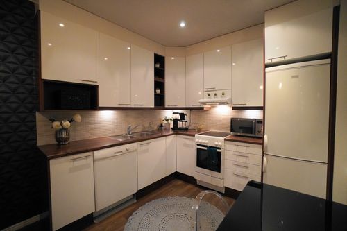 erillinen keittiö, laminaattitasot keittiössä, keraaminen- tai induktioliesi; liesituuletin, astianpesukone (60cm), jääkaappipakastin, tilaa isolle ruokapöydälle; paljon kaappitilaa; paljon työskentelytilaa; mikrohylly