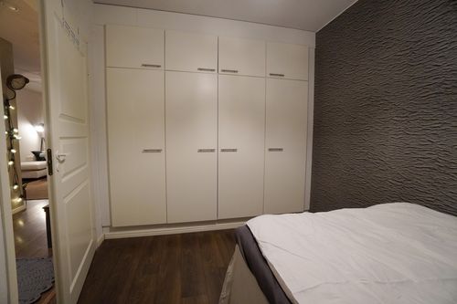 Makuuhuoneeseen mahtuu parisänky ja säilytystilaa on runsaasti. Eteisessä on lisäksi isot kaapistot lisäsäilytystilaa tuomassa.