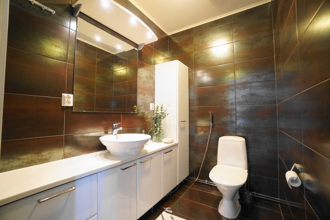 laattalattia; laattaseinä, myös erillinen WC, allaskaappi; peilikaappi; muuta säilytystilaa WC:ssä, suihku, pesukonevalmius, lattialämmitys; sauna