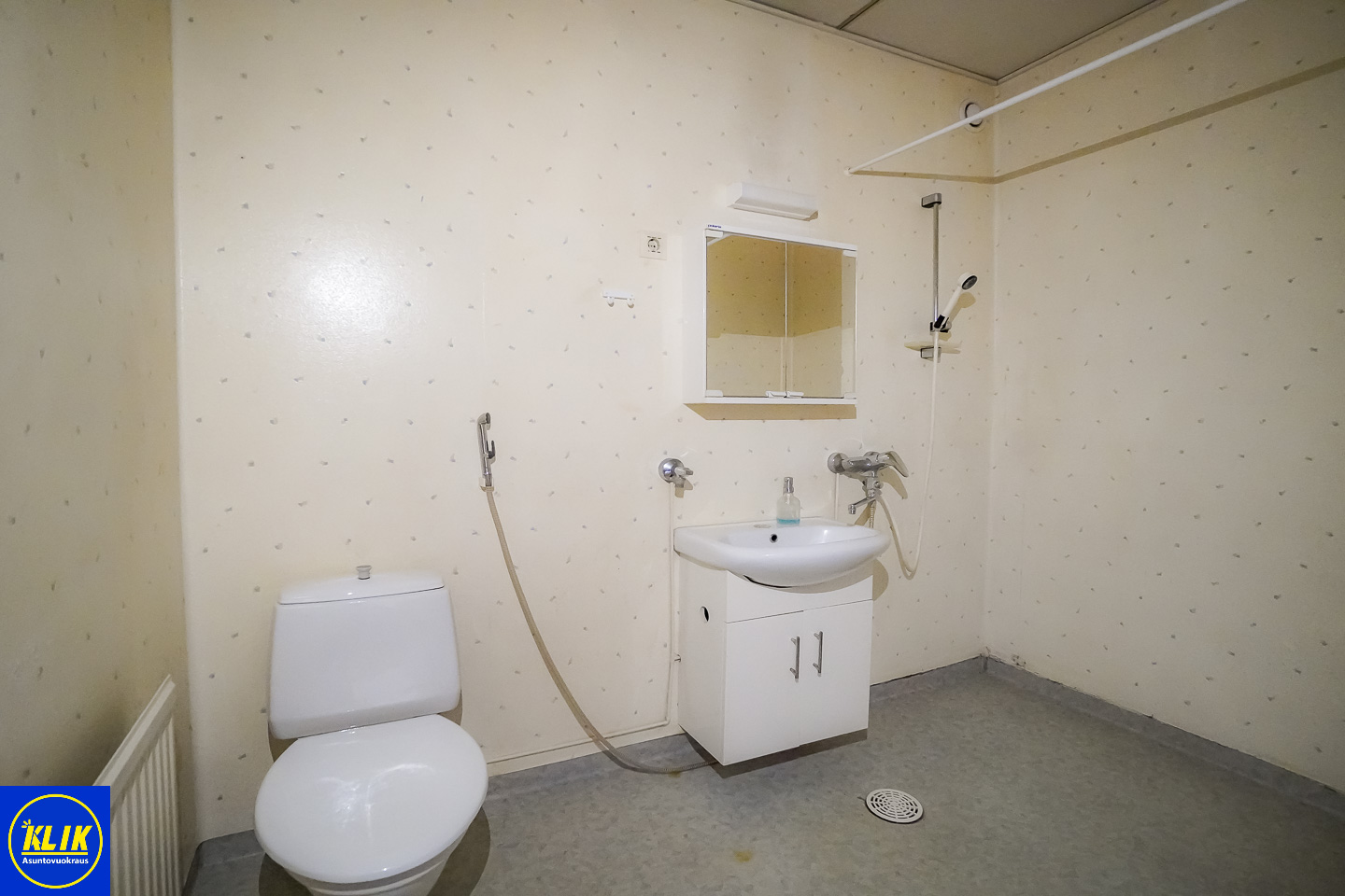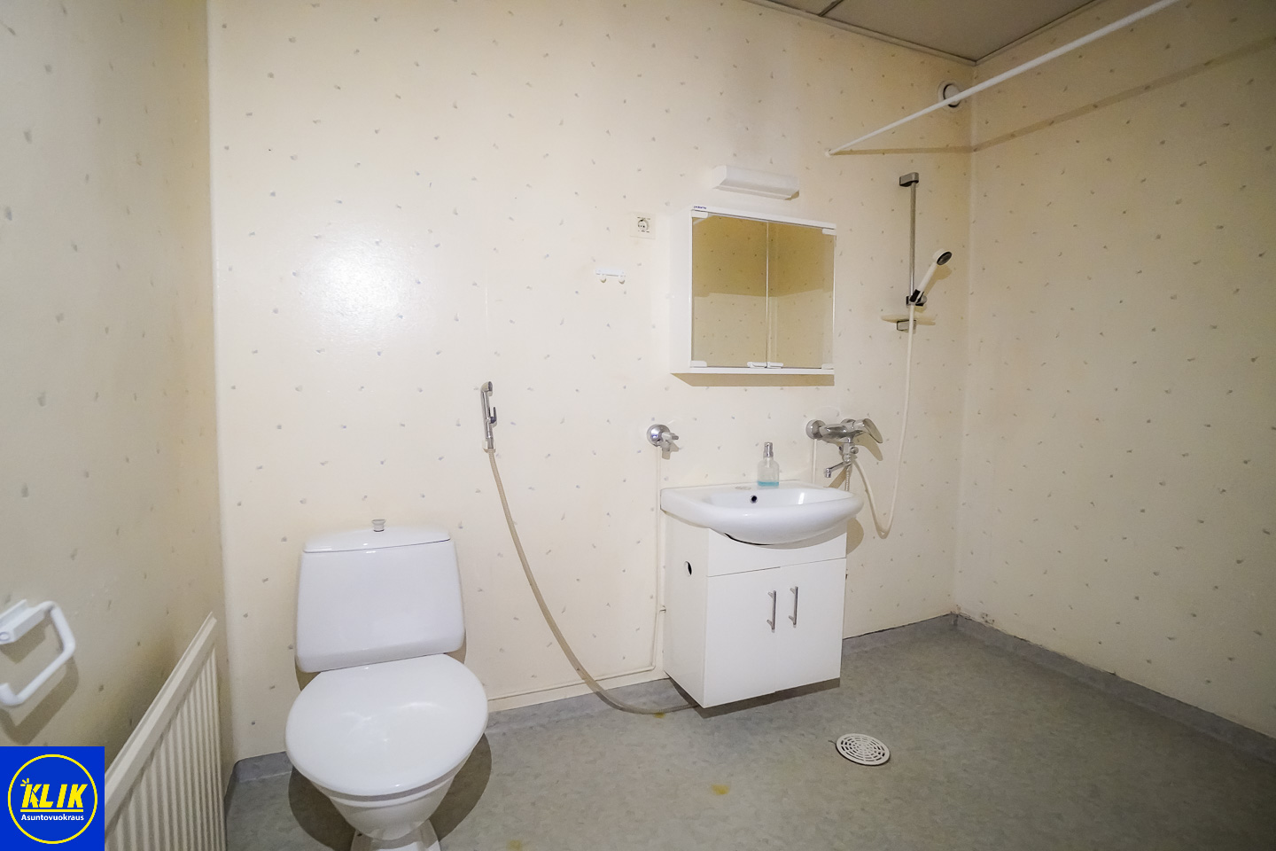 muovimatto; suihkutapetti, allaskaappi; peilikaappi, suihku, pesukonevalmius; taloyhtiössä pesutupa; taloyhtiössä kuivaushuone, taloyhtiössä sauna