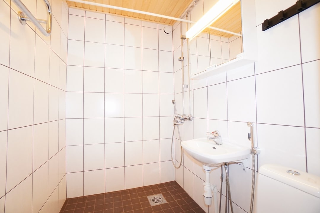 laattalattia; laattaseinä, myös erillinen WC, allaskaappi; peilikaappi, suihku, pesukonevalmius, lattialämmitys; sauna