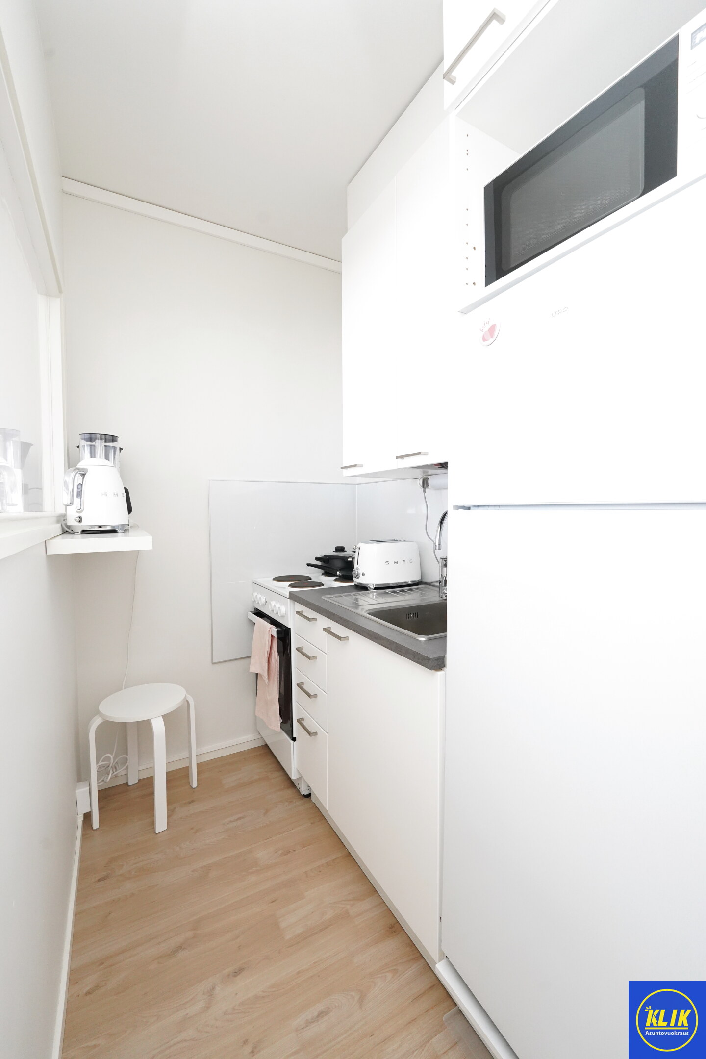 keittokomerolaminaattitasot keittiössä, sähköliesi, , jenkkikaappi, mikrohylly