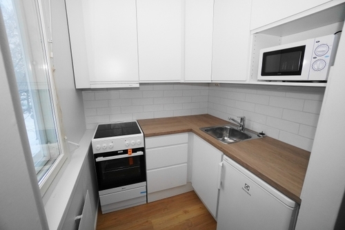 keittokomero, laminaattitasot keittiössä, keraaminen- tai induktioliesi; liesituuletin, jääkaappi pakastelokerolla, mikrohylly