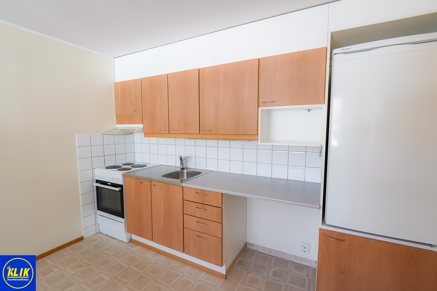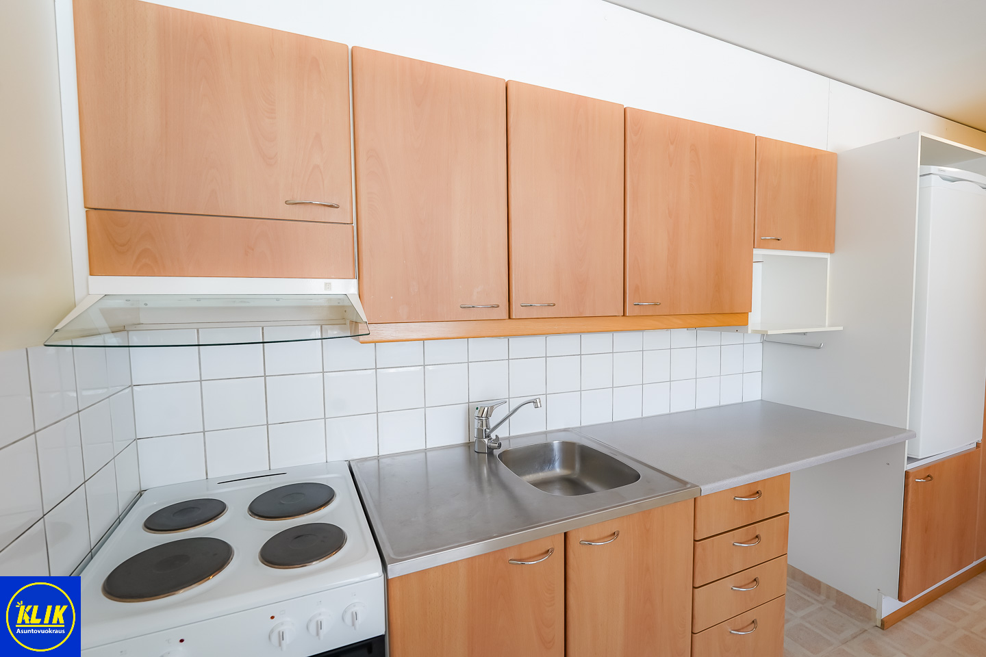 avokeittiöterästasot keittiössä; laminaattitasot keittiössä, sähköliesi; liesituuletin, , jääkaappi pakastelokerolla,