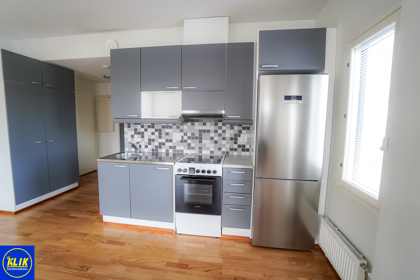 avokeittiöterästasot keittiössä; laminaattitasot keittiössä, keraaminen- tai induktioliesi; liesituuletin, pesukoneliitos, astianpesukone on mahdollista asentaa, jääkaappipakastin, tilaa isolle ruokapöydälle; paljon kaappitilaa; mikrohylly