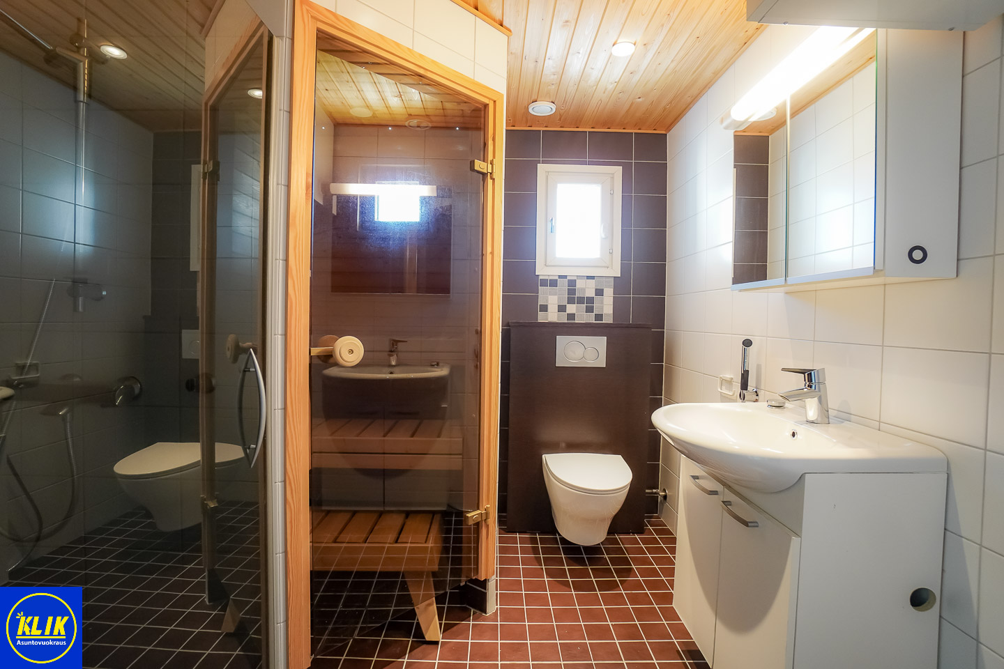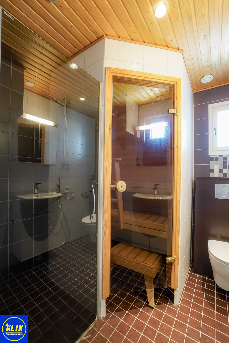 laattalattia; laattaseinä, , allaskaappi; peilikaappi, suihku; suihkuseinä, , pesukonevalmius, kylpyhuoneessa lattialämmitys; oma sauna; kylpyhuoneessa avattava ikkuna