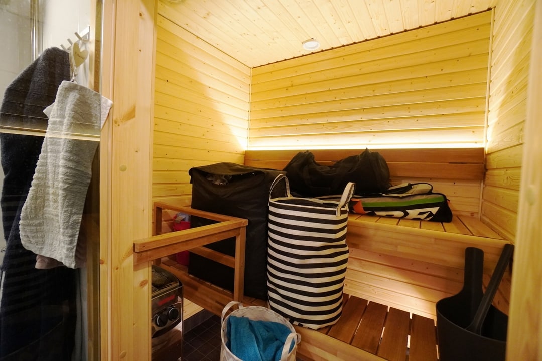 Makuuhuoneessa on runsaasti kaappitilaa ja lisää säilytystilaa tuovat eteisen peliovikaapistot. Kylpyhuoneen yhteydessä on tilava sauna. Upeat laatoitukset tekevät kokonaisuudesta näyttävän. Kylpyhuoneessa on paikka pesutornille ja lisäksi siellä on lattialämmitys.