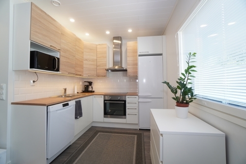 avokeittiö, laminaattitasot keittiössä, keraaminen- tai induktioliesi; liesi ja uuni erikseen; liesituuletin, astianpesukone (60cm), jääkaappipakastin, mikrohylly
