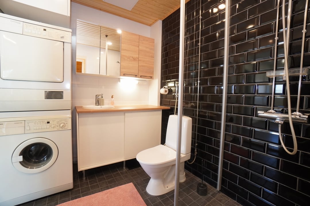 laattalattia; laattaseinä, allaskaappi; peilikaappi, suihku; suihkuseinä, pesukonevalmius, lattialämmitys; sauna