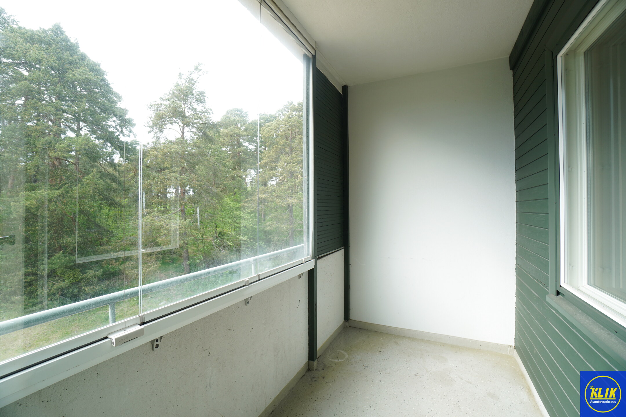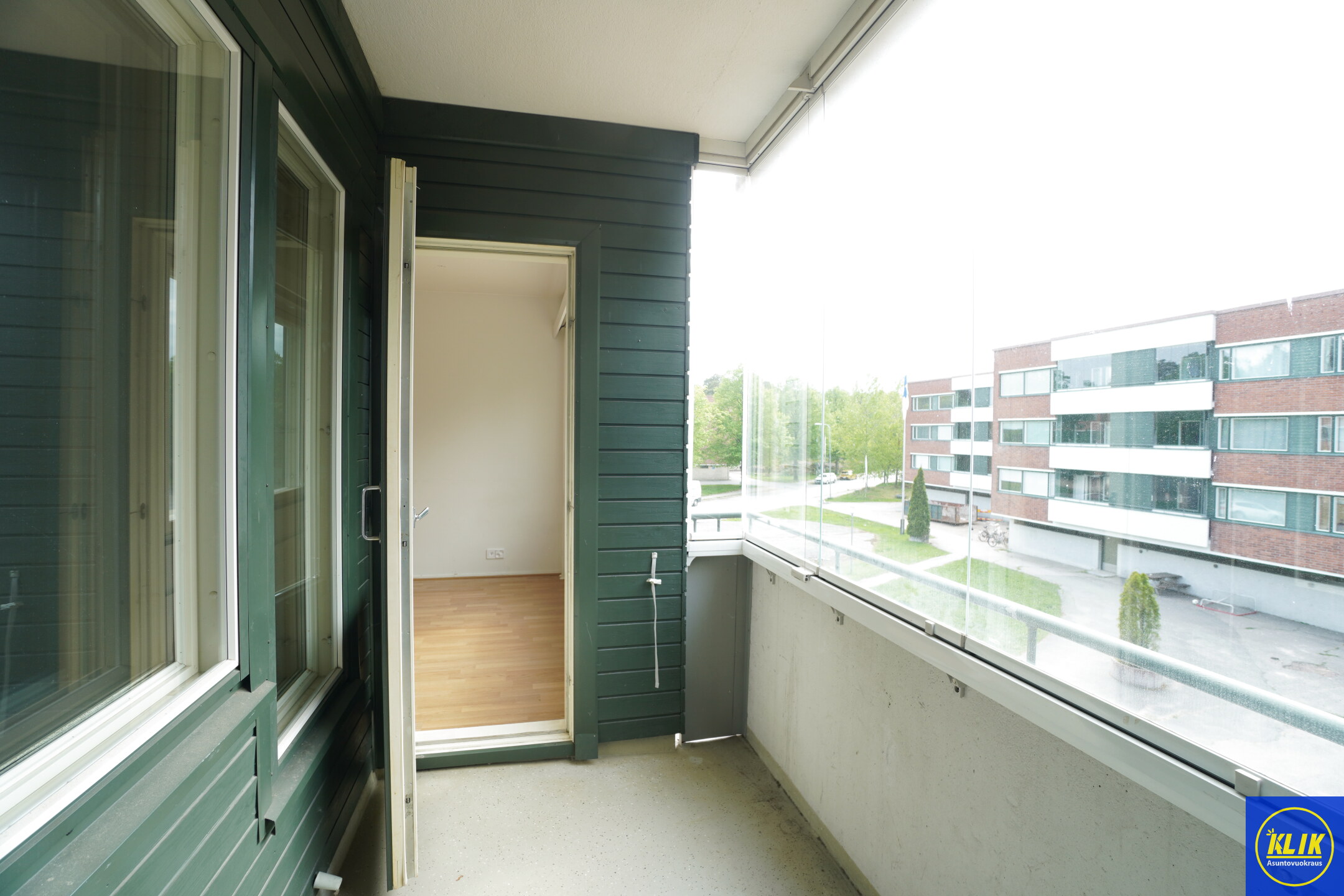 Olohuoneen suuret ikkunat tulvivat luonnonvaloa, ja laminaattilattiat sekä maalatut seinät luovat raikkaan ilmeen. Asunnossa on tilava lasitettu parveke!