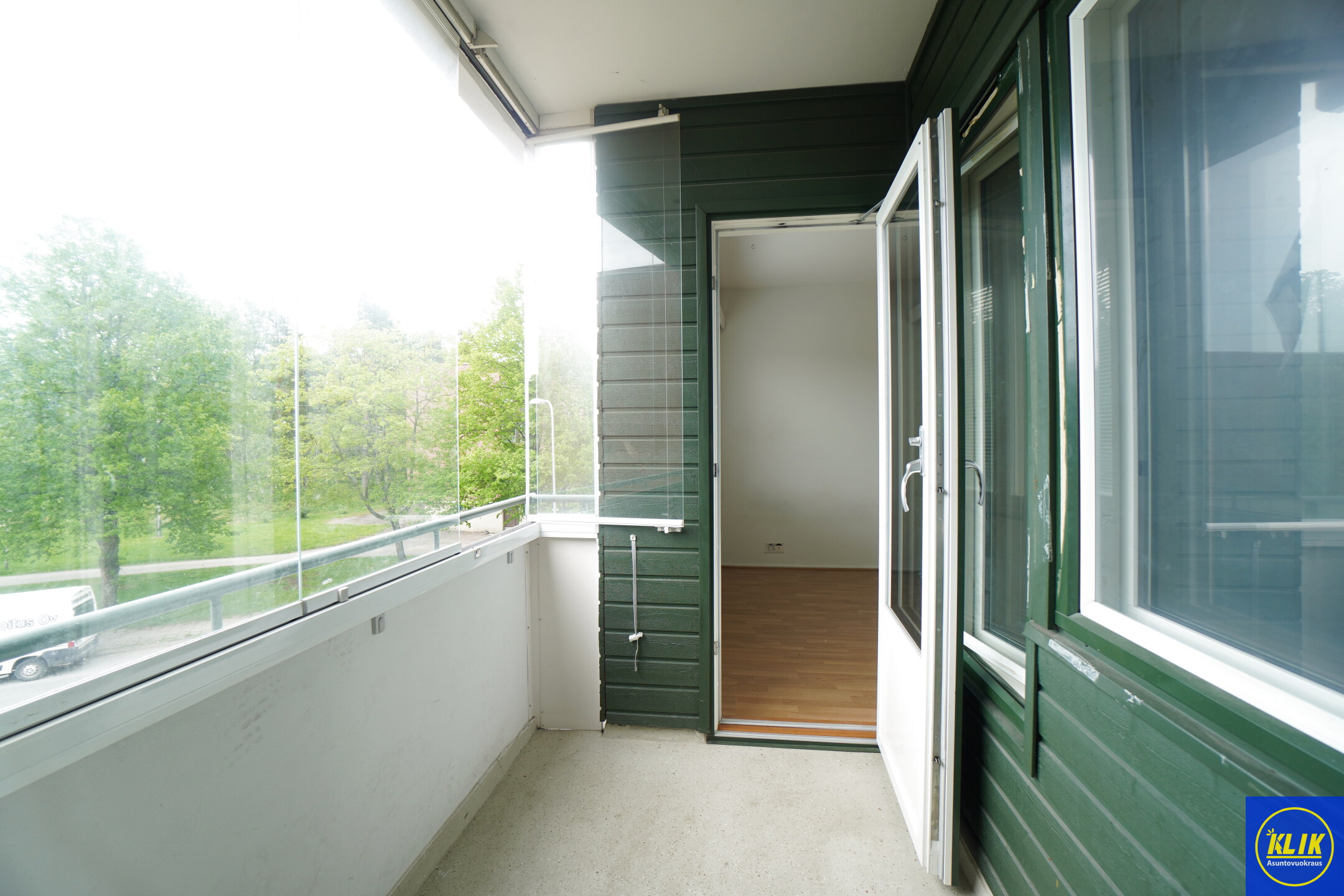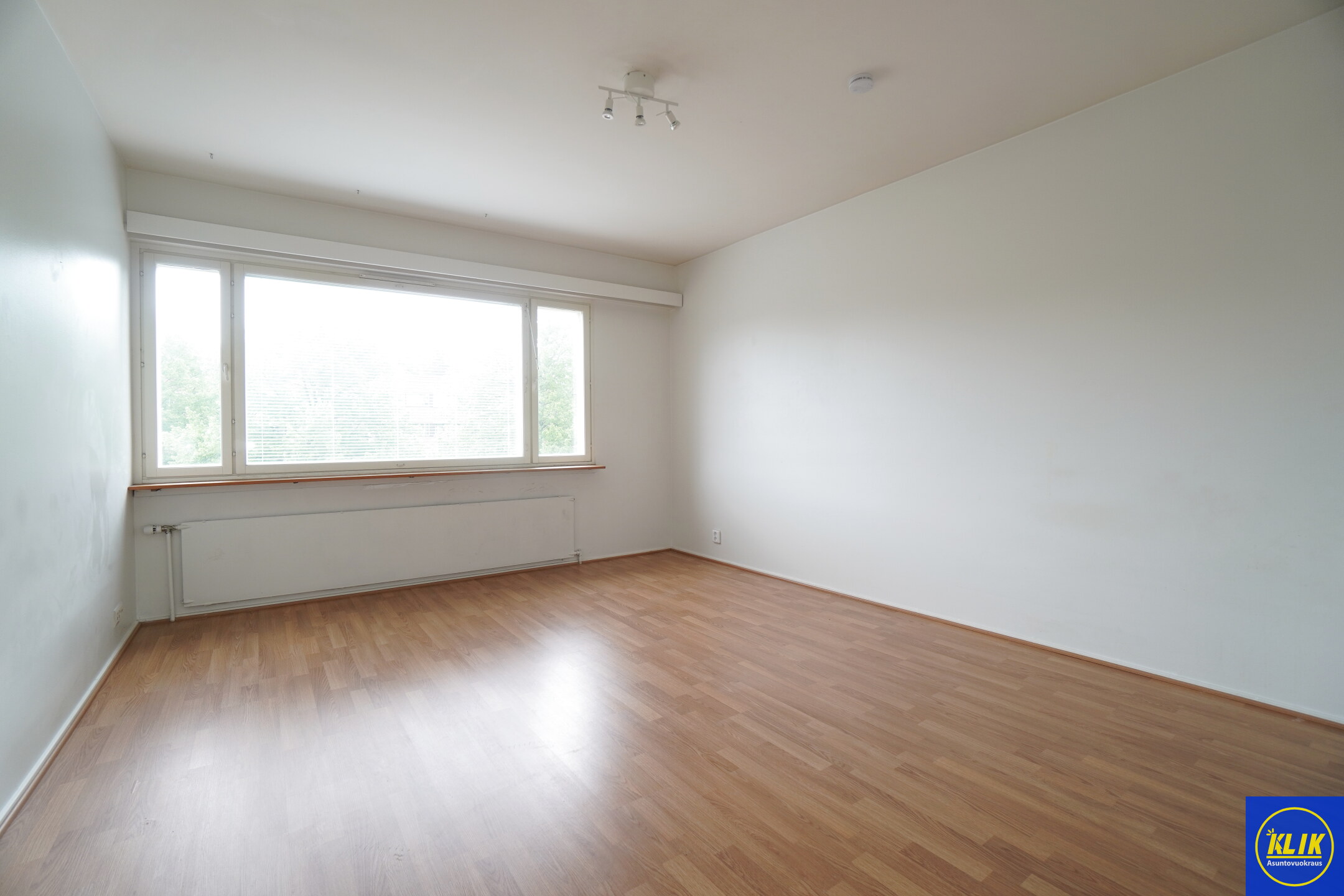Olohuoneen suuret ikkunat tulvivat luonnonvaloa, ja laminaattilattiat sekä maalatut seinät luovat raikkaan ilmeen. Asunnossa on tilava lasitettu parveke!