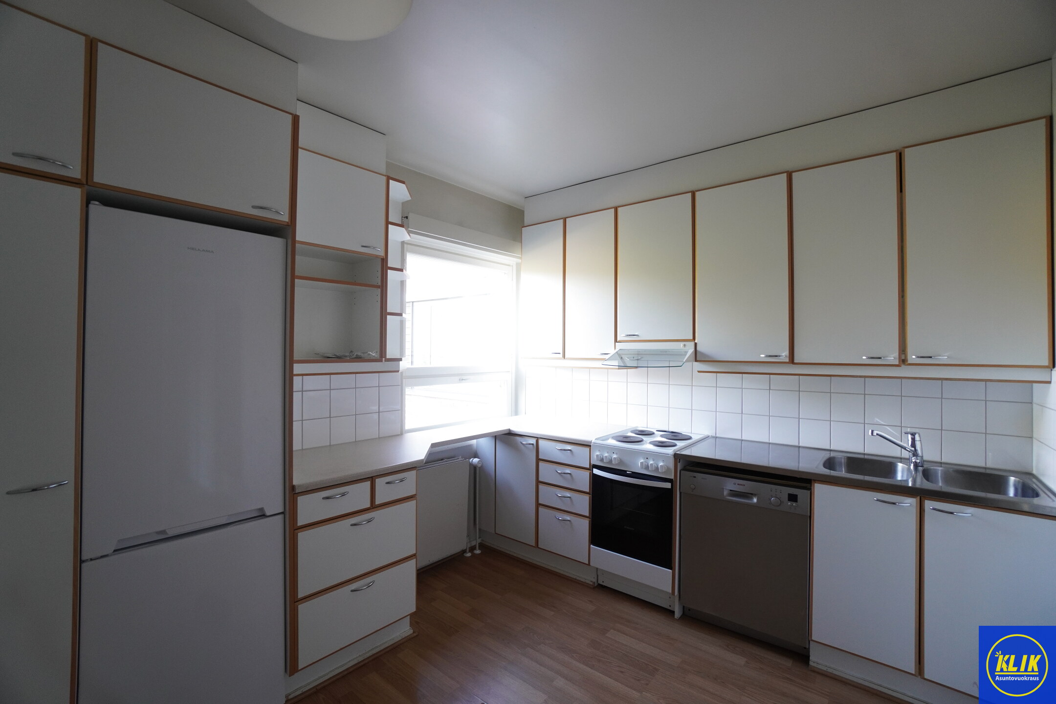 erillinen keittiölaminaattitasot keittiössä, sähköliesi; liesituuletin, pesukoneliitos, astianpesukone on mahdollista asentaa, jääkaappipakastin, tilaa isolle ruokapöydälle; paljon kaappitilaa; paljon työskentelytilaa