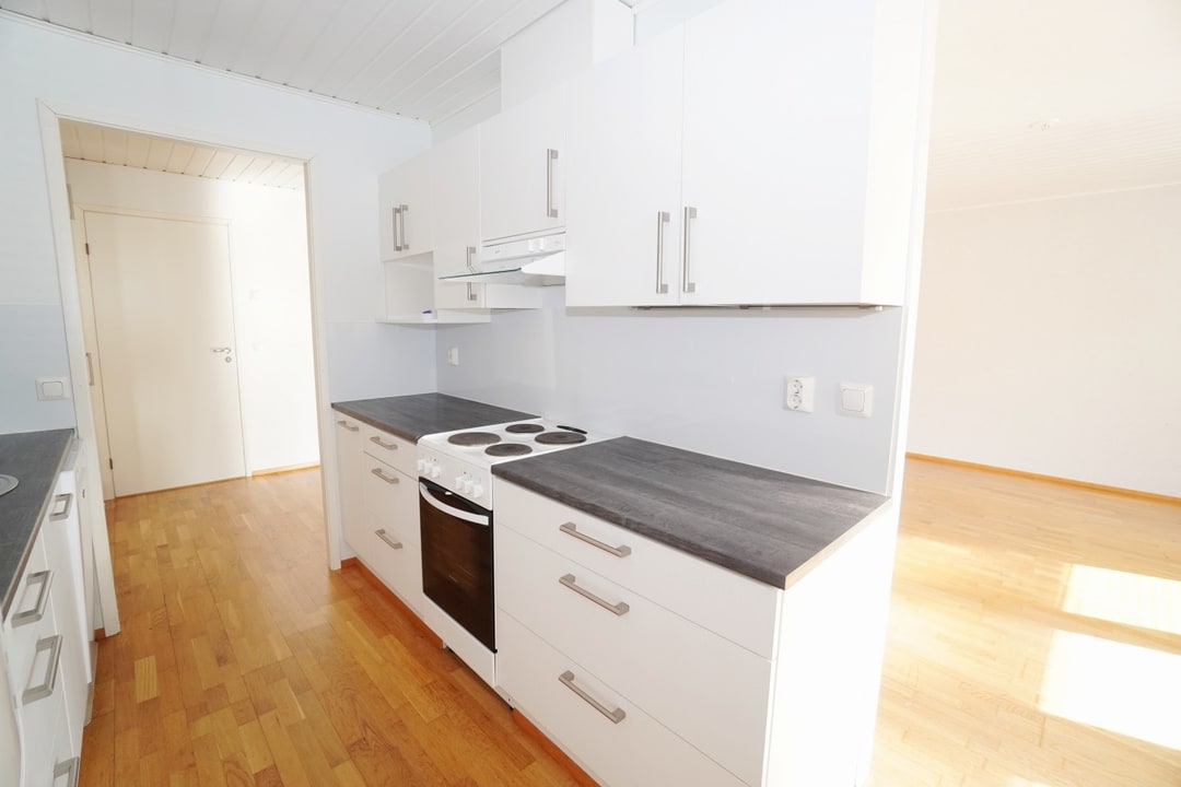 erillinen keittiö, laminaattitasot keittiössä, sähköliesi; liesituuletin, astianpesukone (60cm), jääkaappipakastin, tilaa isolle ruokapöydälle; paljon kaappitilaa; paljon työskentelytilaa