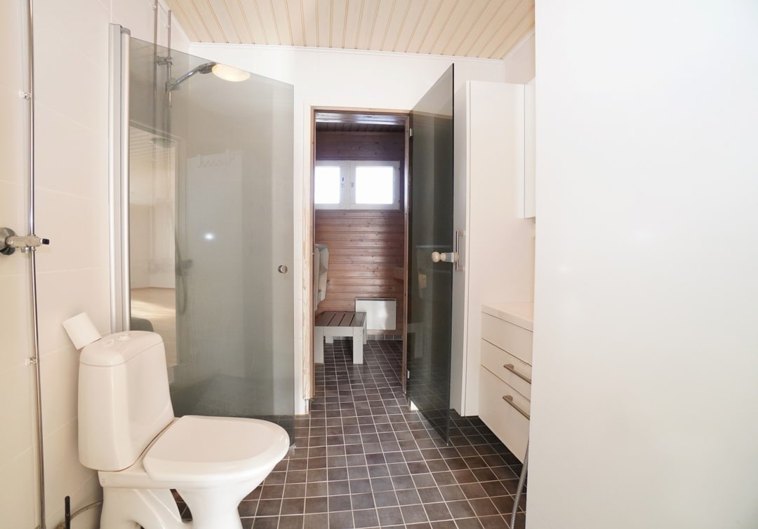 laattalattia; laattaseinä, allaskaappi; peilikaappi; muuta säilytystilaa WC:ssä, suihku; suihkuseinä, pesukonevalmius, lattialämmitys; sauna; avattava ikkuna