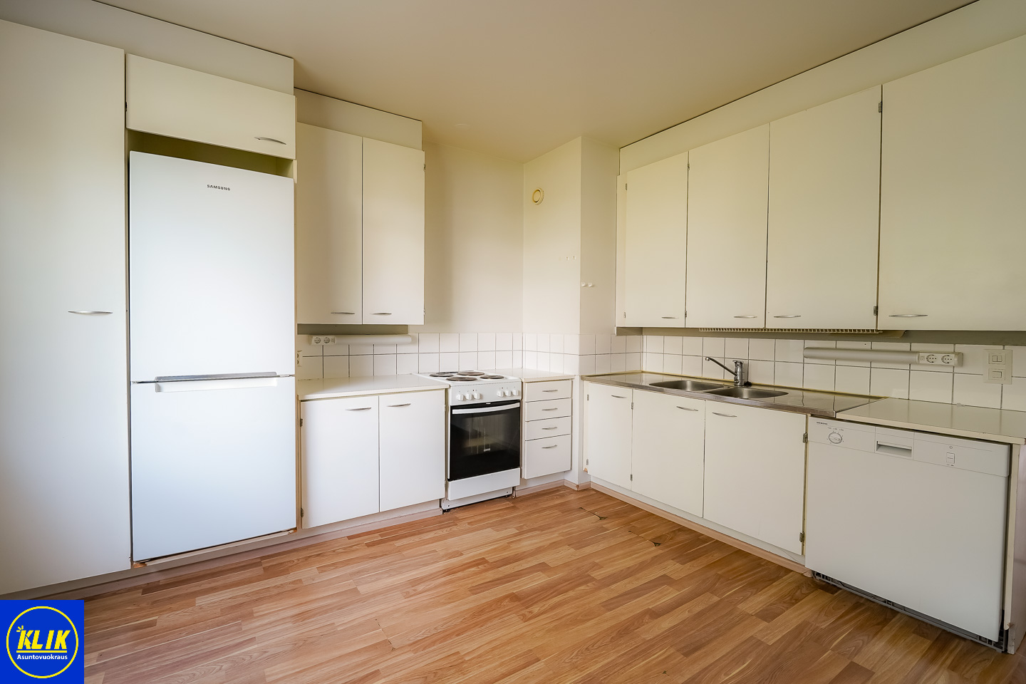 erillinen keittiö, laminaattitasot keittiössä, sähköliesi; liesituuletin, astianpesukone (60cm), jääkaappipakastin, tilaa isolle ruokapöydälle; paljon kaappitilaa; paljon työskentelytilaa; suuri tiskipöytä