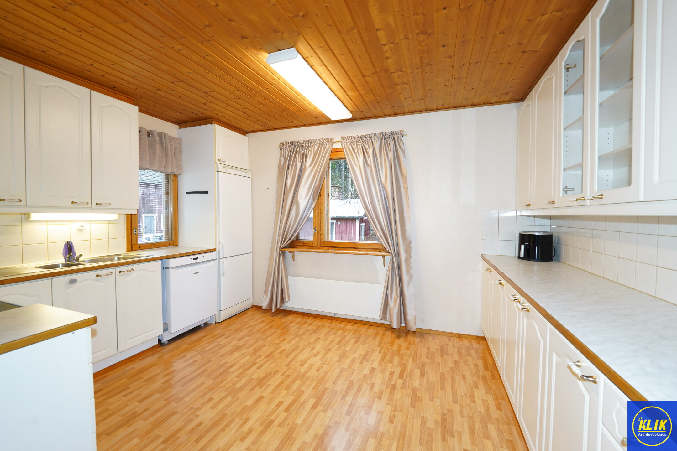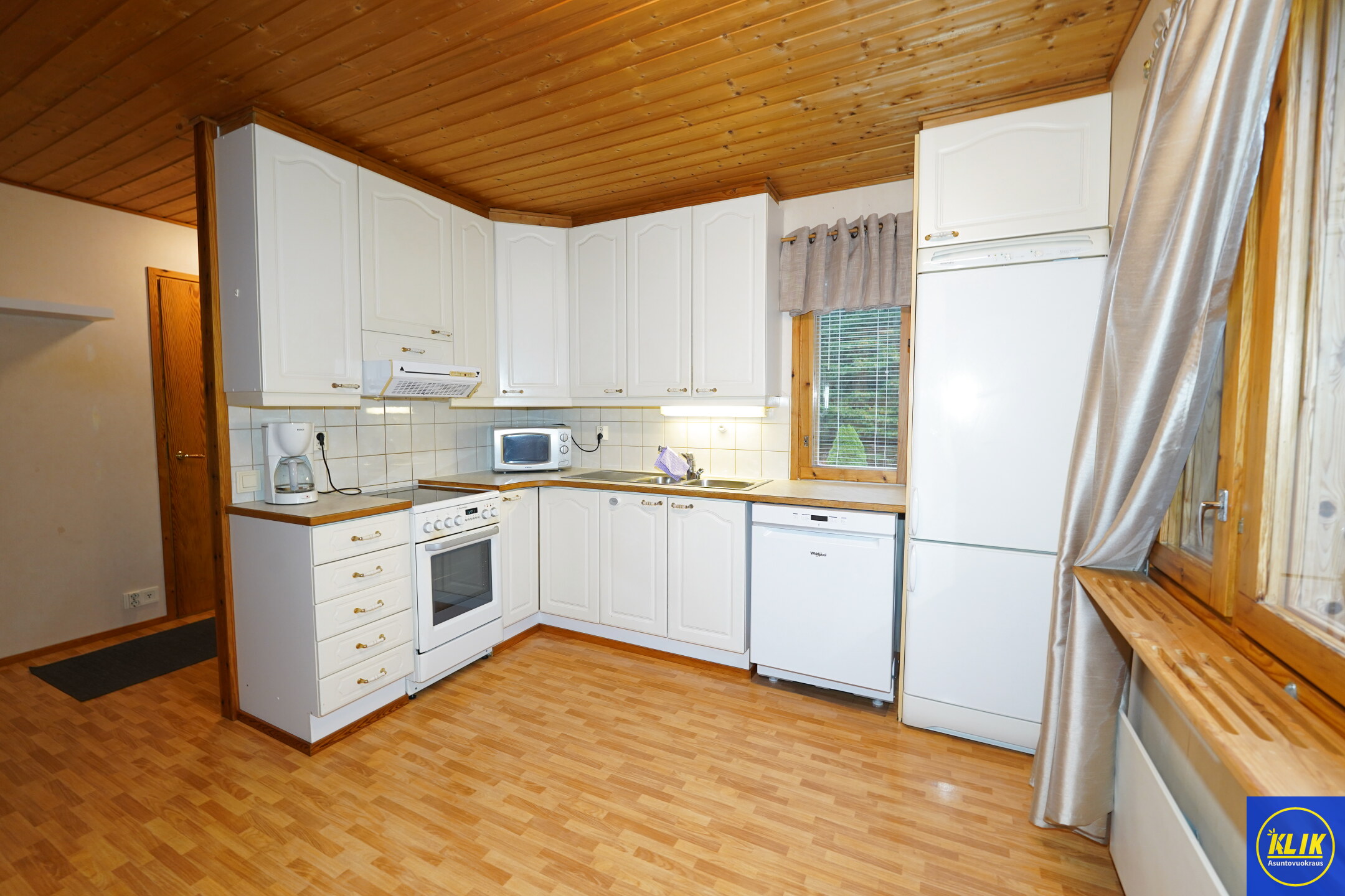erillinen keittiölaminaattitasot keittiössä, keraaminen- tai induktioliesi; liesituuletin, astianpesukone (60cm), jääkaappipakastin, tilaa isolle ruokapöydälle; paljon kaappitilaa; paljon työskentelytilaa; mikro valmiina keittiössä