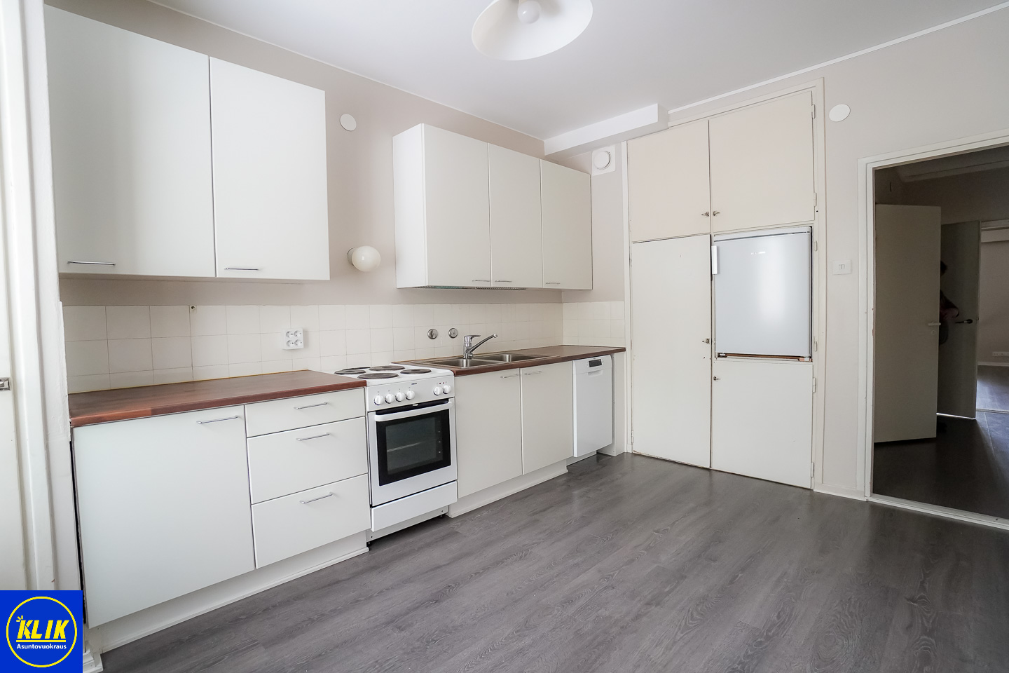 erillinen keittiölaminaattitasot keittiössä, sähköliesi, astianpesukone (45cm), jääkaappi, tilaa isolle ruokapöydälle; paljon kaappitilaa; paljon työskentelytilaa