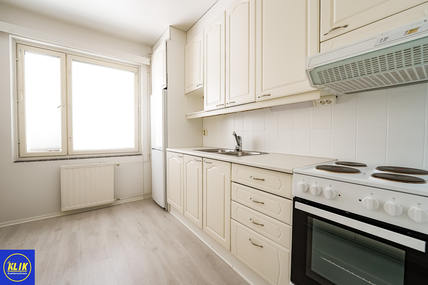 erillinen keittiö, laminaattitasot keittiössä, sähköliesi; liesituuletin, pesukoneliitos, jääkaappipakastin, paljon kaappitilaa; paljon työskentelytilaa