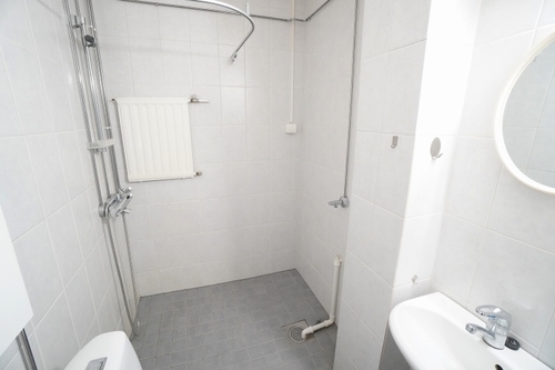 Putkiremontti on tähän yhtiöön tehty ja kylpyhuone on kokonaan uusittu. Värimaailma on neutraali, seinissä on valkoista laattaa ja lattia on harmaa. Pesukoneelle on liitännät ja hyvä paikka.