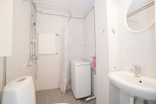 Putkiremontti on tähän yhtiöön tehty ja kylpyhuone on kokonaan uusittu. Värimaailma on neutraali, seinissä on valkoista laattaa ja lattia on harmaa. Pesukoneelle on liitännät ja hyvä paikka.