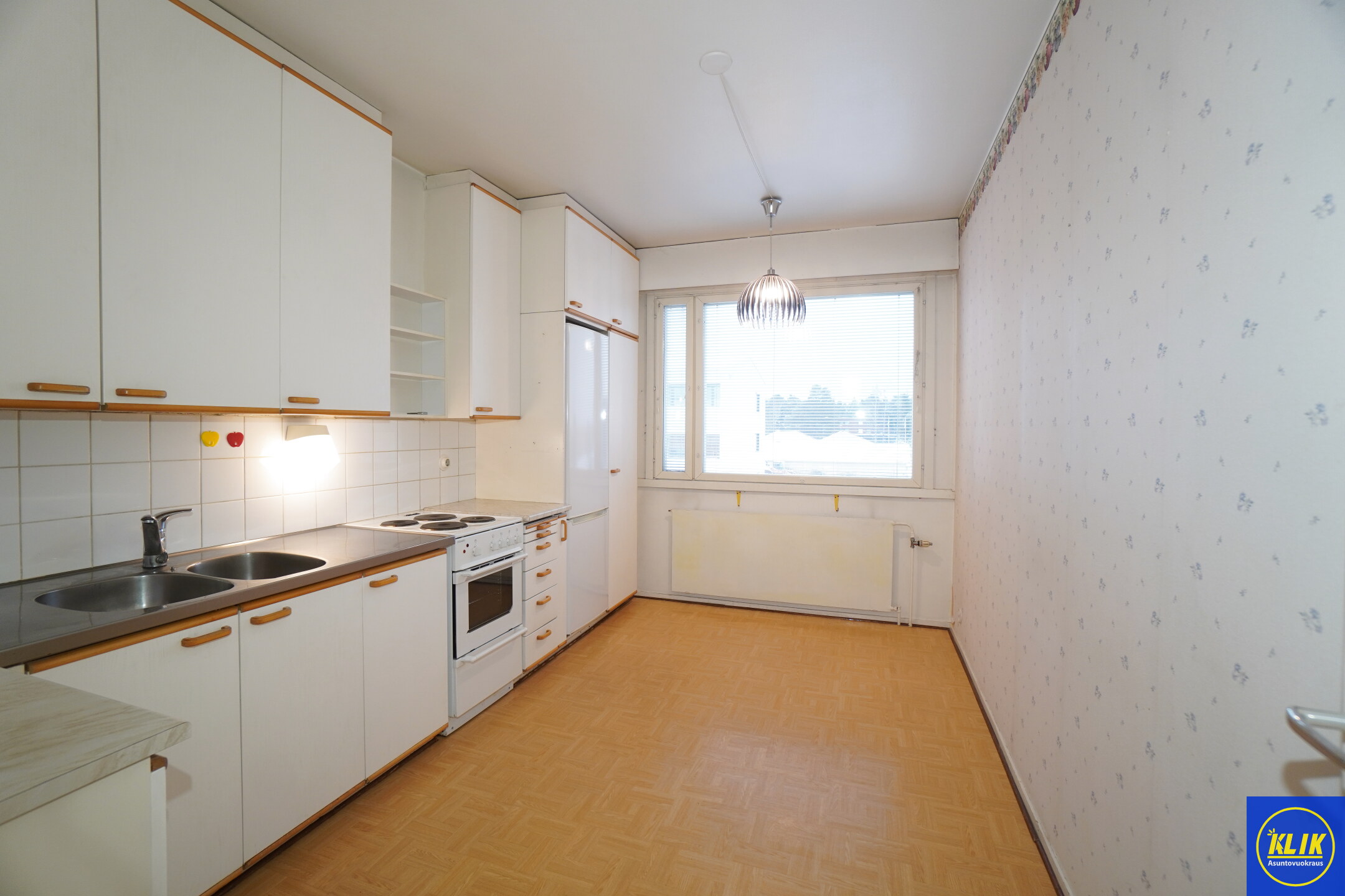 erillinen keittiöterästasot keittiössä; laminaattitasot keittiössä, sähköliesi; liesituuletin, , jääkaappipakastin, tilaa isolle ruokapöydälle; paljon kaappitilaa; paljon työskentelytilaa; suuri tiskipöytä