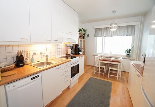Tässä kodissa on tilava ja hyväkuntoinen keittiö. Keittiössä on hyvä paikka ruokapöydälle astianpesukone löytyy. Olohuone on reilun kokoinen ja sen yhteydessä on lasitettu parveke, josta on kivat näkymät sisäpihan suuntaan.