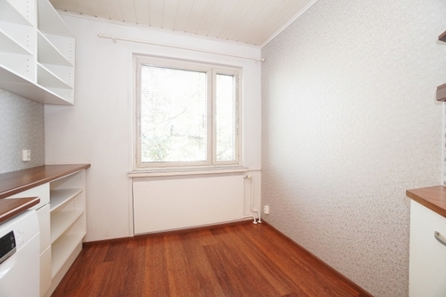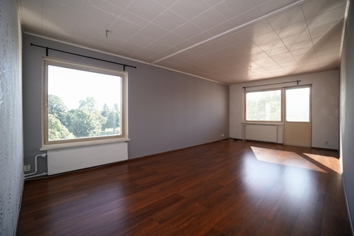 Huoneisto on yleisilmeeltään siistissä kunnossa, lattiat ovat laminaattia ja seinät ovat tapetoitu / maalattu. Olohuone on tilava ja sen yhteyteen mahtuu vaivatta suurempikin sohvaryhmä sekä ruokailuryhmä. Keittiöstä löydät kaiken tarpeellisen mm. astianpesukoneen sekä erinomaisesti kaappitilaa.