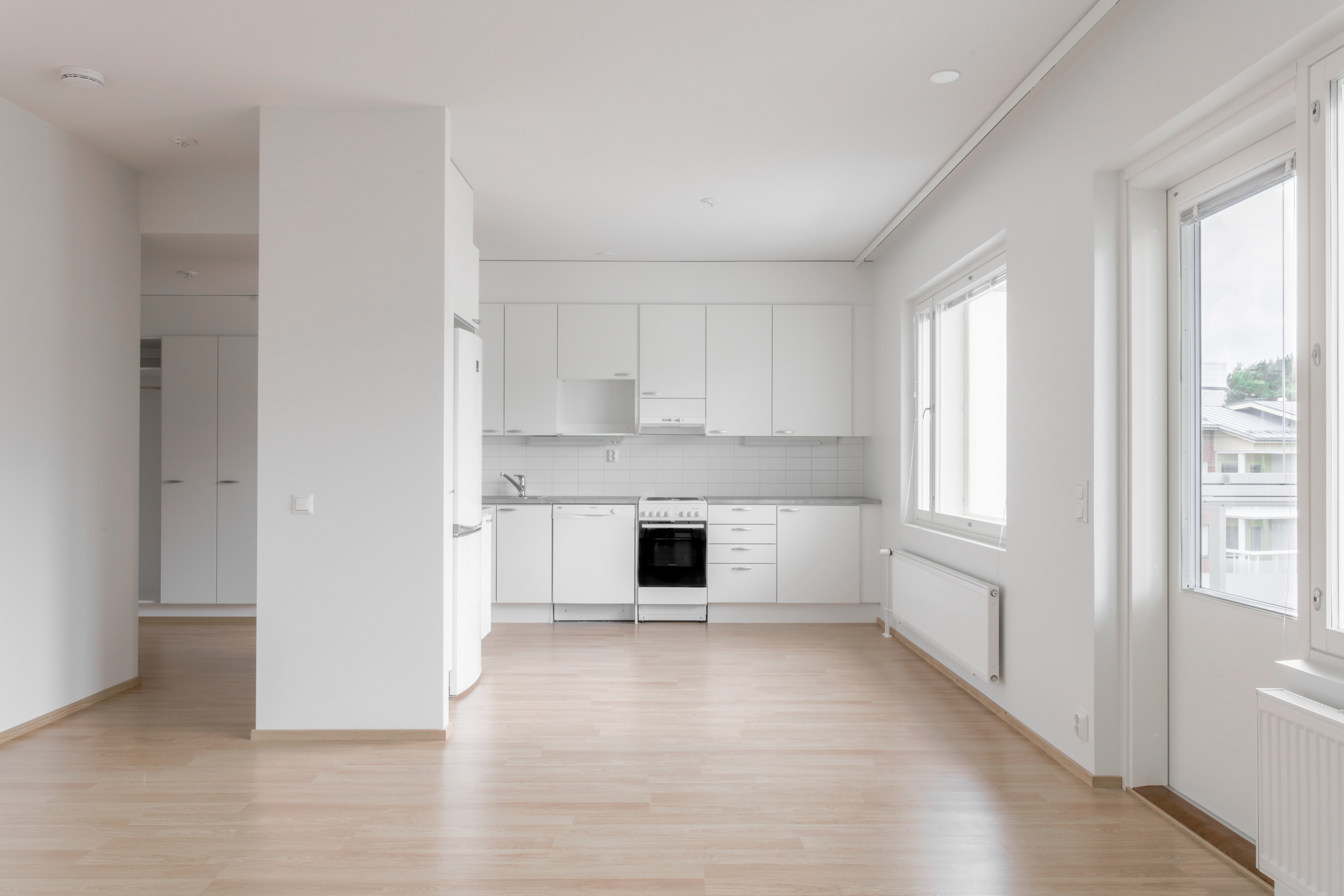 avokeittiölaminaattitasot keittiössä, sähköliesi; liesituuletin, astianpesukone (45cm); pesukoneliitos, astianpesukone on mahdollista asentaa, jääkaappipakastin, tilaa isolle ruokapöydälle