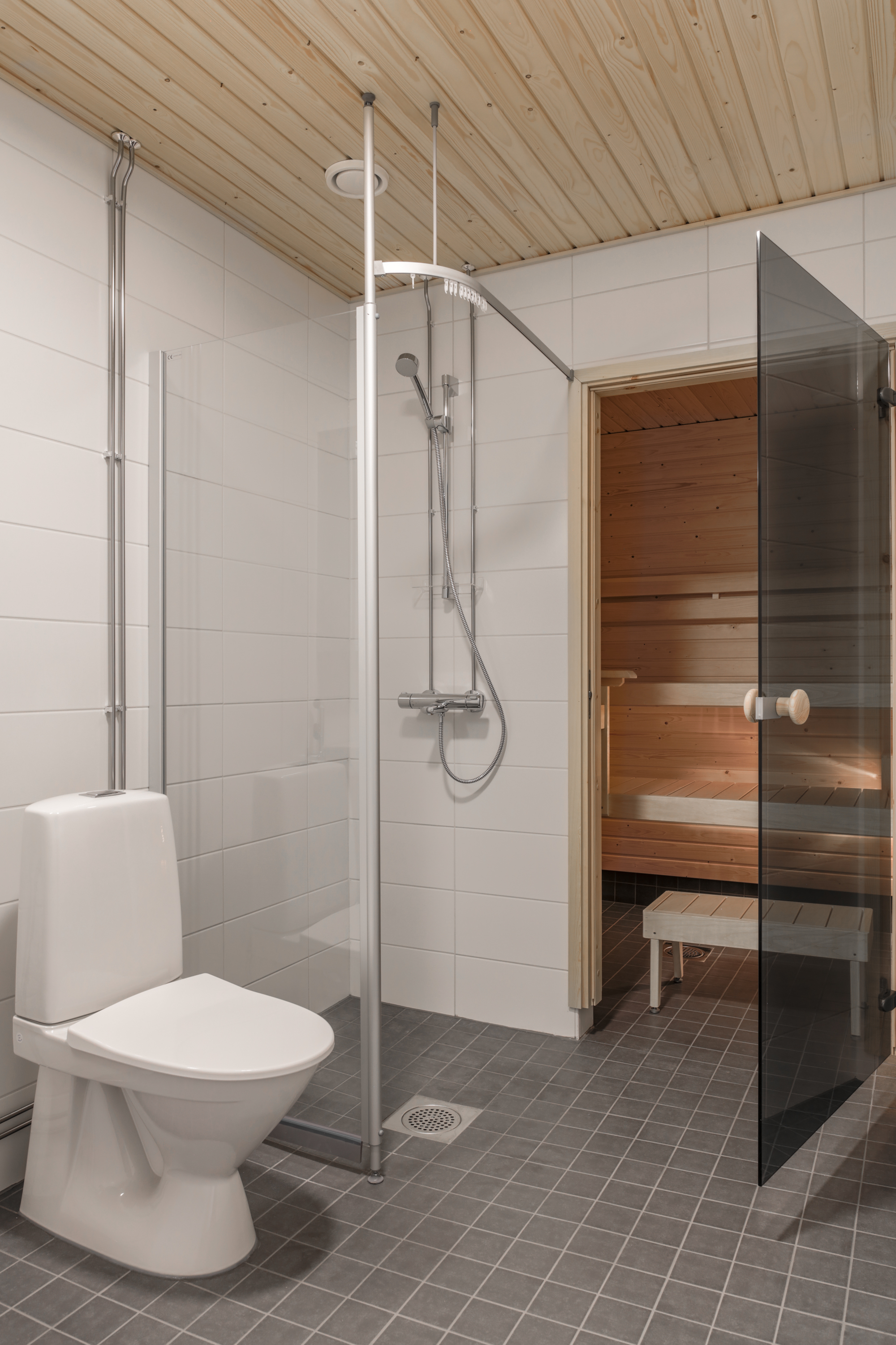 laattalattia; laattaseinä, , allaskaappi; peilikaappi; pyykkikaappi, suihku; suihkuseinä, , pesukonevalmius, kylpyhuoneessa lattialämmitys; oma sauna