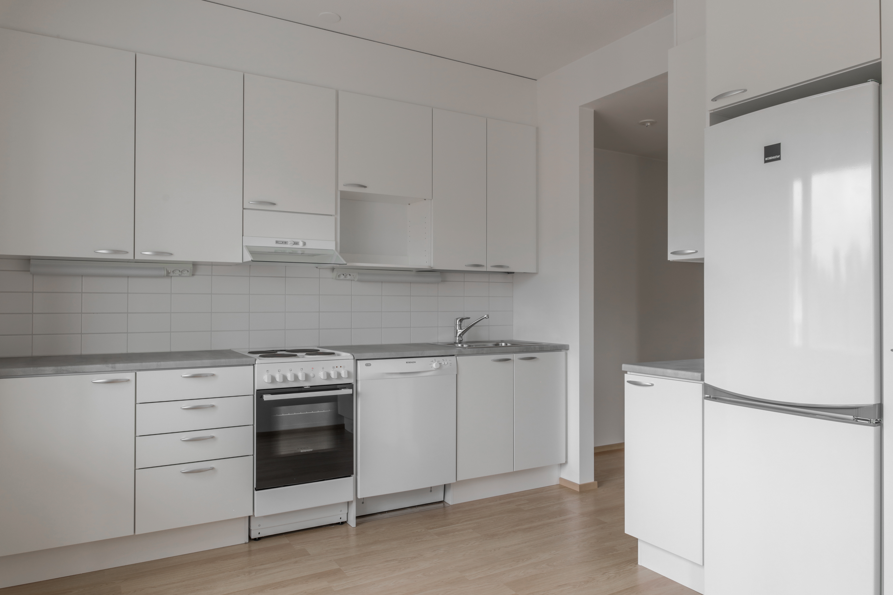 erillinen keittiölaminaattitasot keittiössä, sähköliesi; liesituuletin, astianpesukone (60cm), jääkaappipakastin, tilaa isolle ruokapöydälle; paljon kaappitilaa; paljon työskentelytilaa