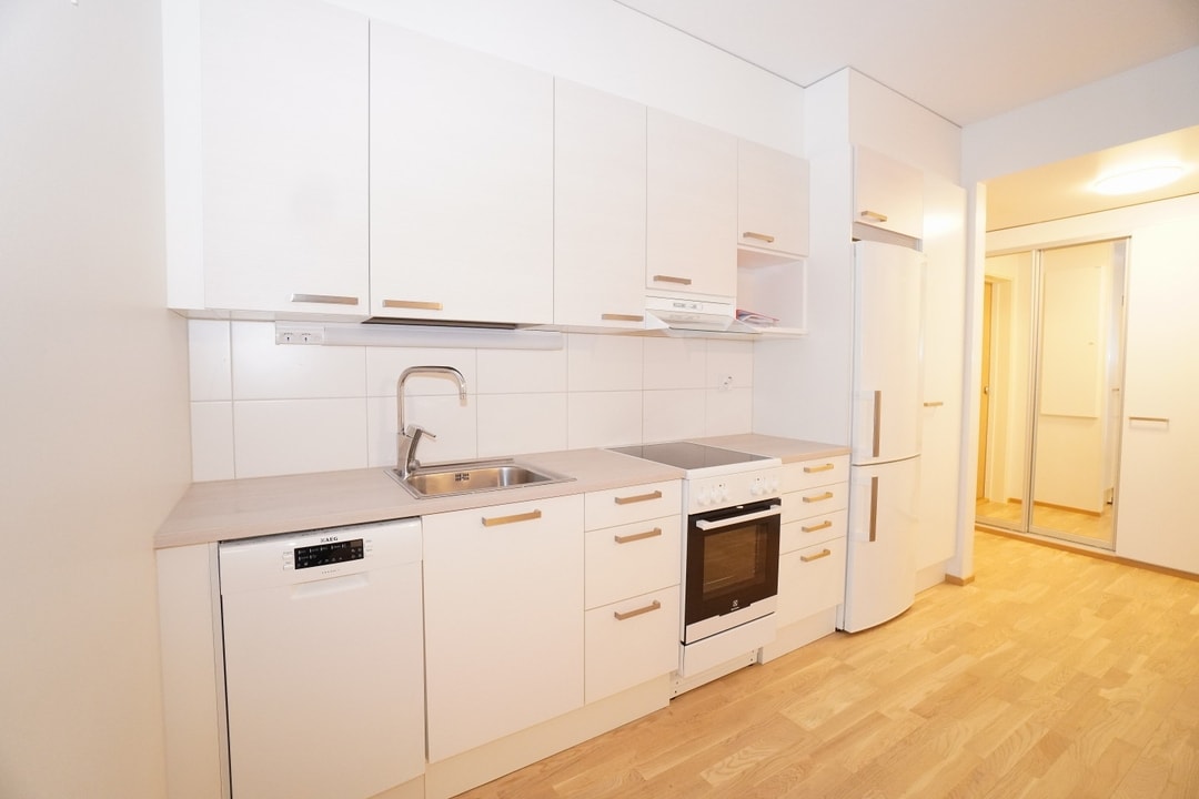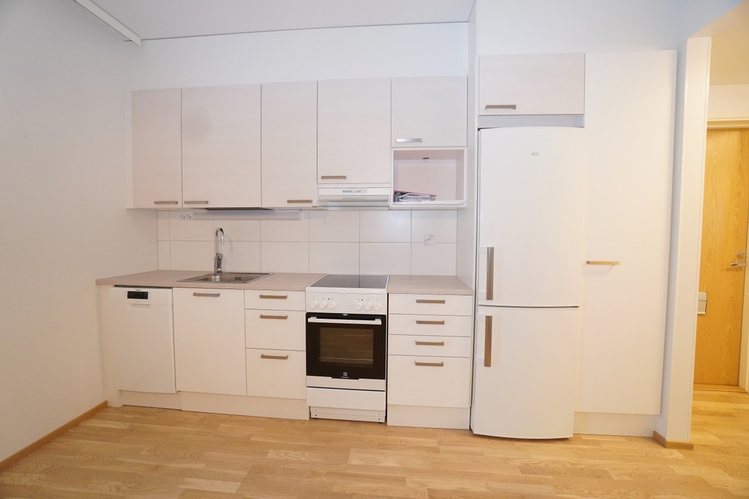 avokeittiö, laminaattitasot keittiössä, sähköliesi; liesi ja uuni erikseen; liesituuletin, astianpesukone (45cm), jääkaappipakastin, mikrohylly