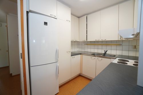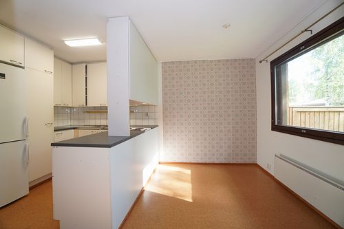 erillinen keittiö, laminaattitasot keittiössä, sähköliesi; liesituuletin, jääkaappipakastin, paljon kaappitilaa; paljon työskentelytilaa