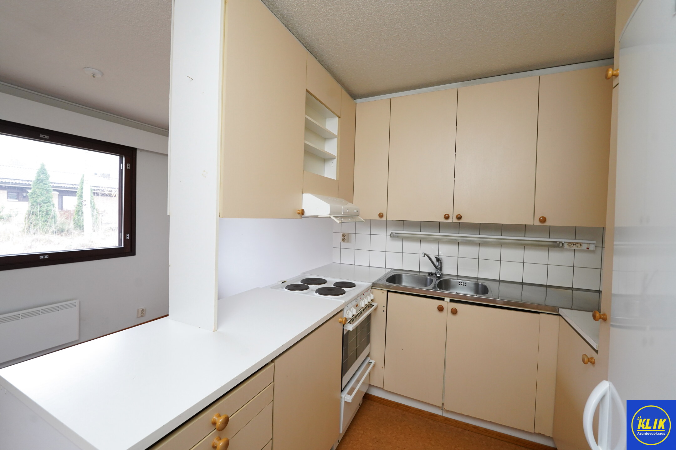 erillinen keittiölaminaattitasot keittiössä, sähköliesi; liesituuletin, , jääkaappipakastin, tilaa isolle ruokapöydälle; paljon kaappitilaa