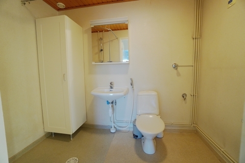 Kylpyhuoneessa on suihkun lisäksi säilytystilaa, peilikaappi sekä paikka pyykinpesukoneelle.