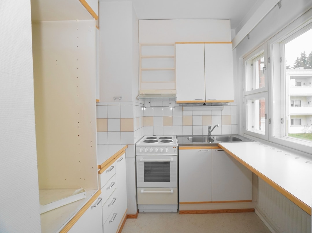 keittokomero, laminaattitasot keittiössä, sähköliesi; liesituuletin, jääkaappi pakastelokerolla,