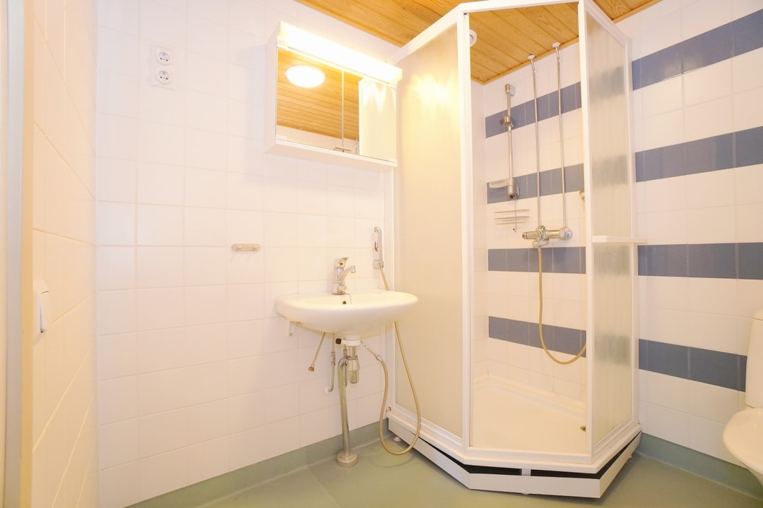 muovimatto; laattaseinä, peilikaappi, suihku; suihkukaappi, pesukonevalmius