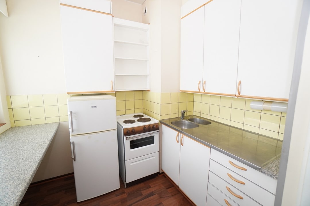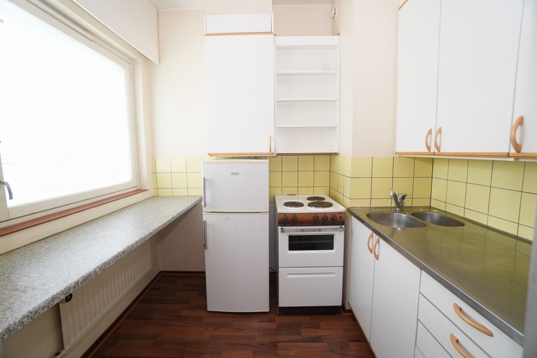 Hyvällä pohjalla varustettu asunto, jota remontoidaan parhaillaan. Seinäpinnat uusitaan kauttaaltaan ja lattiassa on siisti laminaatti. Keittiössä on kaikki tarvittavat kodinkoneet ja iso ikuuna tuo valoa tilaan. Kaapistojakin on runsaasti ja lisää löytyy eteisestä. Alkoviin mahtuu vaivatta sänky.