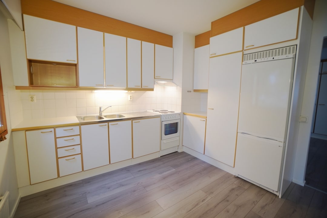 erillinen keittiö, puutasot keittiössä; laminaattitasot keittiössä, sähköliesi; liesituuletin, pesukoneliitos, jääkaappipakastin, tilaa isolle ruokapöydälle; paljon kaappitilaa; paljon työskentelytilaa; suuri tiskipöytä; mikrohylly