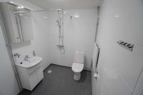 muovimatto; laattaseinä, allaskaappi; peilikaappi, suihku, pesukonevalmius, lattialämmitys