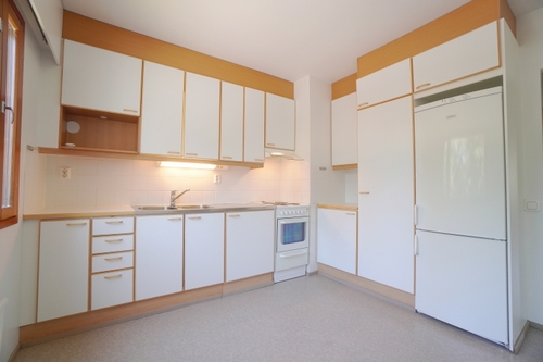 erillinen keittiö, terästasot keittiössä; laminaattitasot keittiössä, sähköliesi; liesituuletin, pesukoneliitos, jääkaappipakastin, tilaa isolle ruokapöydälle; paljon kaappitilaa; paljon työskentelytilaa; suuri tiskipöytä; mikrohylly