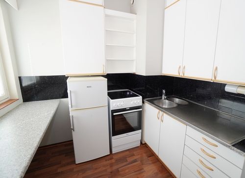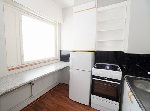 Asunnon keittiö on sekin siistikuntoinen ja kaappitilaa on reilusti. Varustukseen kuuluvat jääkaappi sekä liesi.