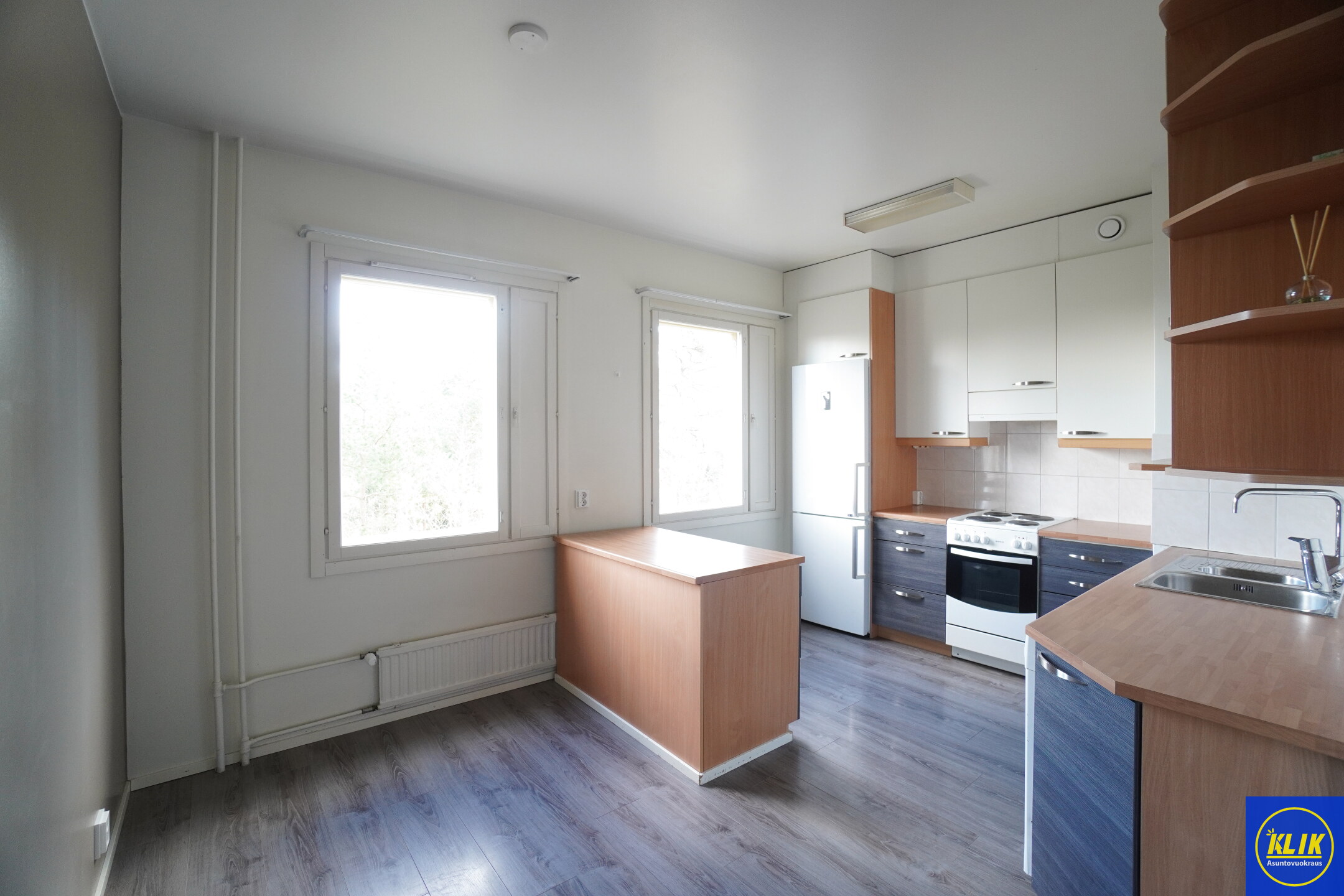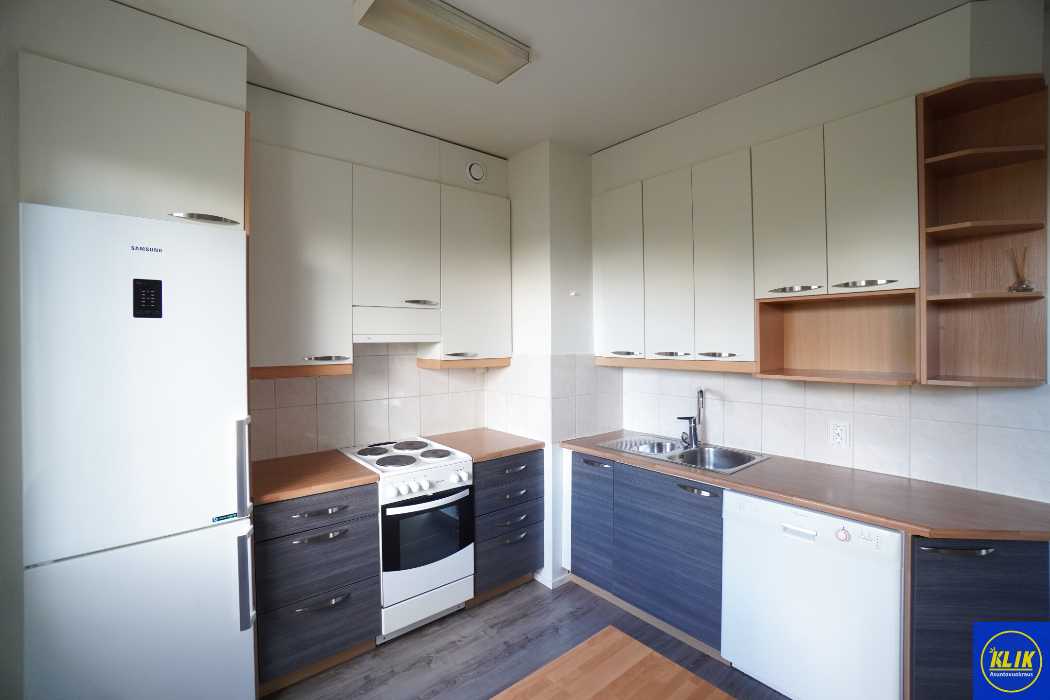erillinen keittiölaminaattitasot keittiössä, sähköliesi; liesituuletin, astianpesukone (60cm); pesukoneliitos, astianpesukone on mahdollista asentaa, jääkaappipakastin, paljon kaappitilaa; suuri tiskipöytä; mikrohylly